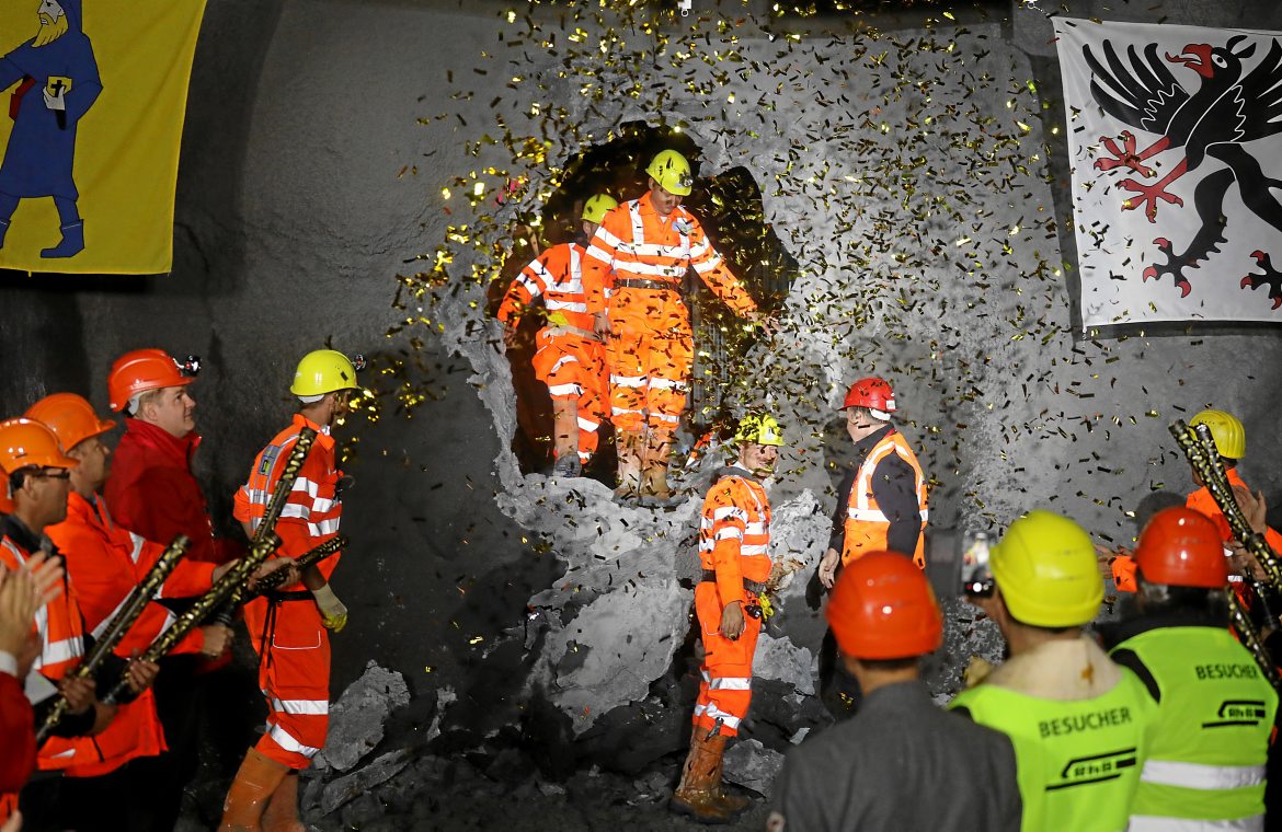 Kurz vor dem Mittag stieg die Mannschaft des Vortriebs Spinas durch die Öffnung im Fels und überreichte den Kollegen des Vortriebs Preda die Statue der Schutzpatronin der Tunnelbauer, die Heilige Barbara. Nach diesem bewegenden Moment und Dankesworten seitens Vertretern der RhB und der beteiligten Unternehmungen konnte auf die gemeinsam vollbrachte Leistung angestossen werden. Insgesamt wurden 250 000 m3 Gestein ausgebrochen. Das Ausbruchmaterial dient als Rohstoff für die Beton- und Schotterproduktion und wird in Preda aufbereitet. Material von ungenügender Qualität wurde über Förderbänder zur baustelleneigenen Deponie «Las Piazzettas» bei Preda transportiert und wird dort landschaftsverträglich wieder eingebaut. Der Hauptdurchstich im Albulatunnel erfolgte knapp ein Jahr nach dem ersten, «kleinen» Durchstich: Am 17. Oktober 2017 war mit dem Durchstich in die sogenannte Kaverne die heikelste Zone des Bergmassivs, die Störzone «Raibler Rauwacke» überwunden worden.