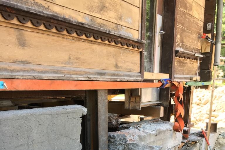 Das Bahnhofsgebäude Spinas muss weichen, jedoch nur 112 cm. Um das Gebäude verschieben zu können, wird es heute Montag, 1. Juli 2019, um rund 50 cm mit Hubpressen angehoben. Im Verlaufe dieser Woche werden darunter Schienen verlegt. Am Montag, 8. Juli 2019, wird das Bahnhofsgebäude schliesslich um 112 cm weg vom heutigen Gleis an seinen künftigen Standort verschoben, wo die neue Unterkellerung bereits erstellt ist.