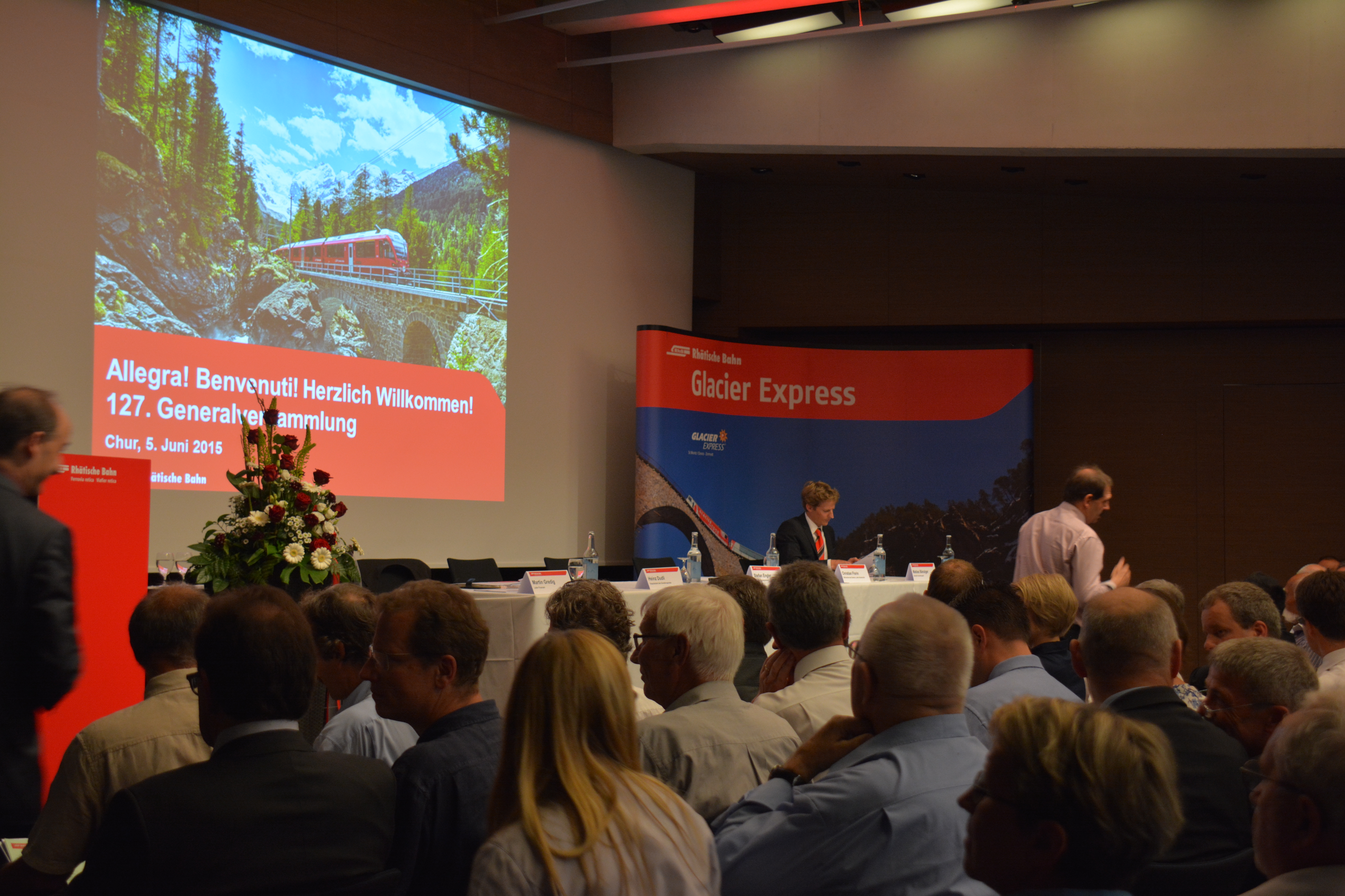 An der 127. Generalversammlung der Rhätischen Bahn (RhB) vom 5. Juni 2015 im GKB Auditorium in Chur präsentierten Verwaltungsratspräsident Stefan Engler und Finanzchef Martin Gredig ein ausgeglichenes Ergebnis für das Jahr 2014. Die Investitionen waren mit 205 Millionen Franken um 7 Prozent höher als im Vorjahr. Christian Florin, Leiter Infrastruktur und stellvertretender Direktor der RhB, informierte über den Stand des Grossprojektes «Neubau Albulatunnel» sowie die wichtigsten weiteren aktuellen Projekte. Im Hinblick auf die schwierige Situation im Tourismus ist auch die RhB gefordert. Stefan Engler verwies in seiner Eröffnungsrede auf die verbindende Funktion, welche die RhB innerhalb Graubündens für die einzelnen Regionen und Leistungsträger hat und rief dazu auf, gemeinsam Lösungen zu finden.