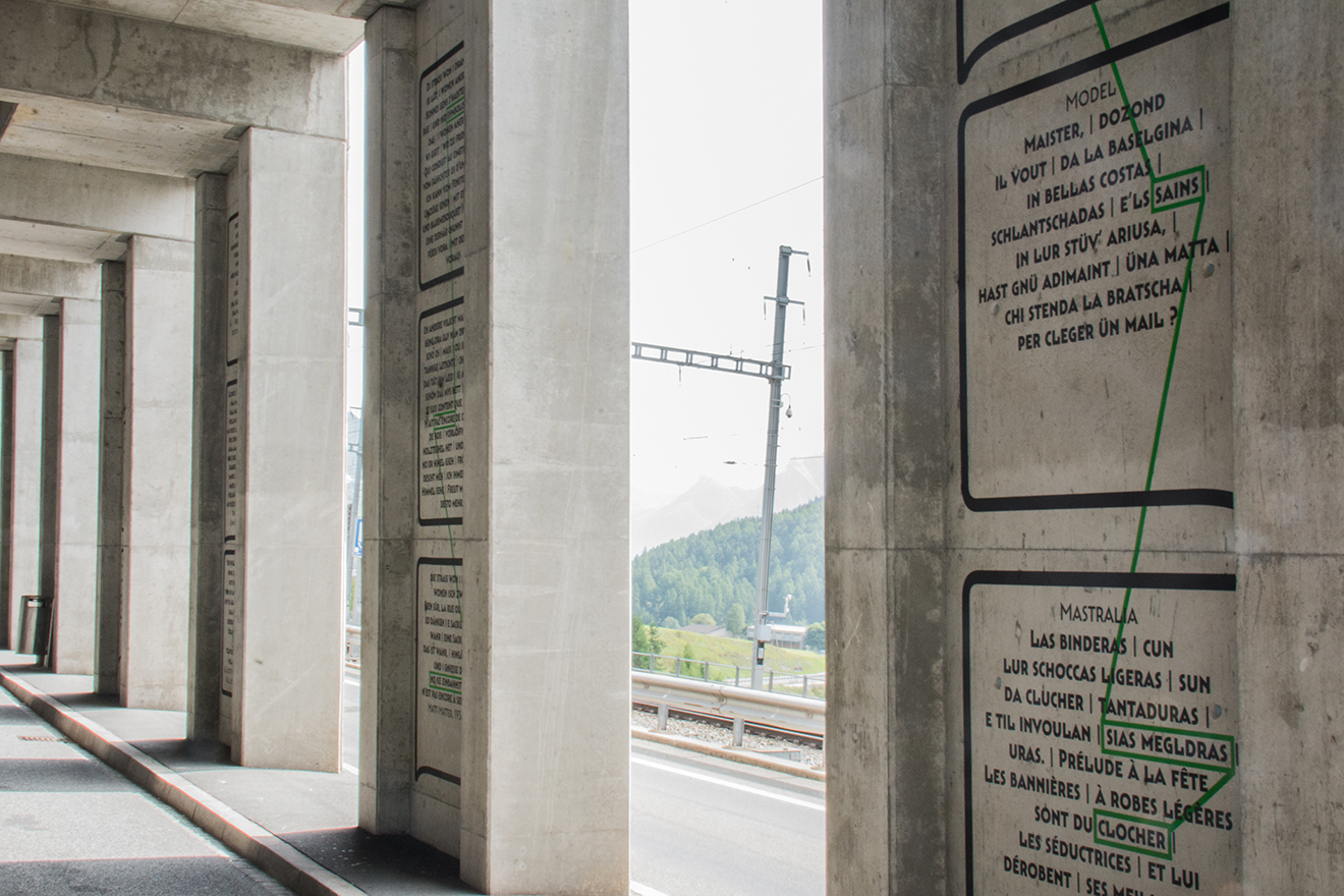 Die Südzufahrt zum Vereinatunnel der Rhätischen Bahn (RhB) in Sagliains dient seit heute als Kulturraum: Auf die Betonpfeiler der Zufahrt werden Gedanken zum Reisen zwischen Sprachen und Kulturen appliziert. Die Installation ist Teil eines Kulturprojektes der Oertli-Stiftung, welche sich für die Mehrsprachigkeit und das gegenseitige Verständnis in der Schweiz einsetzt. Die Eröffnung der Installation in Sagliains fand heute Montag, 28. August 2017 statt. Sie ist bis Ende Oktober zu sehen.