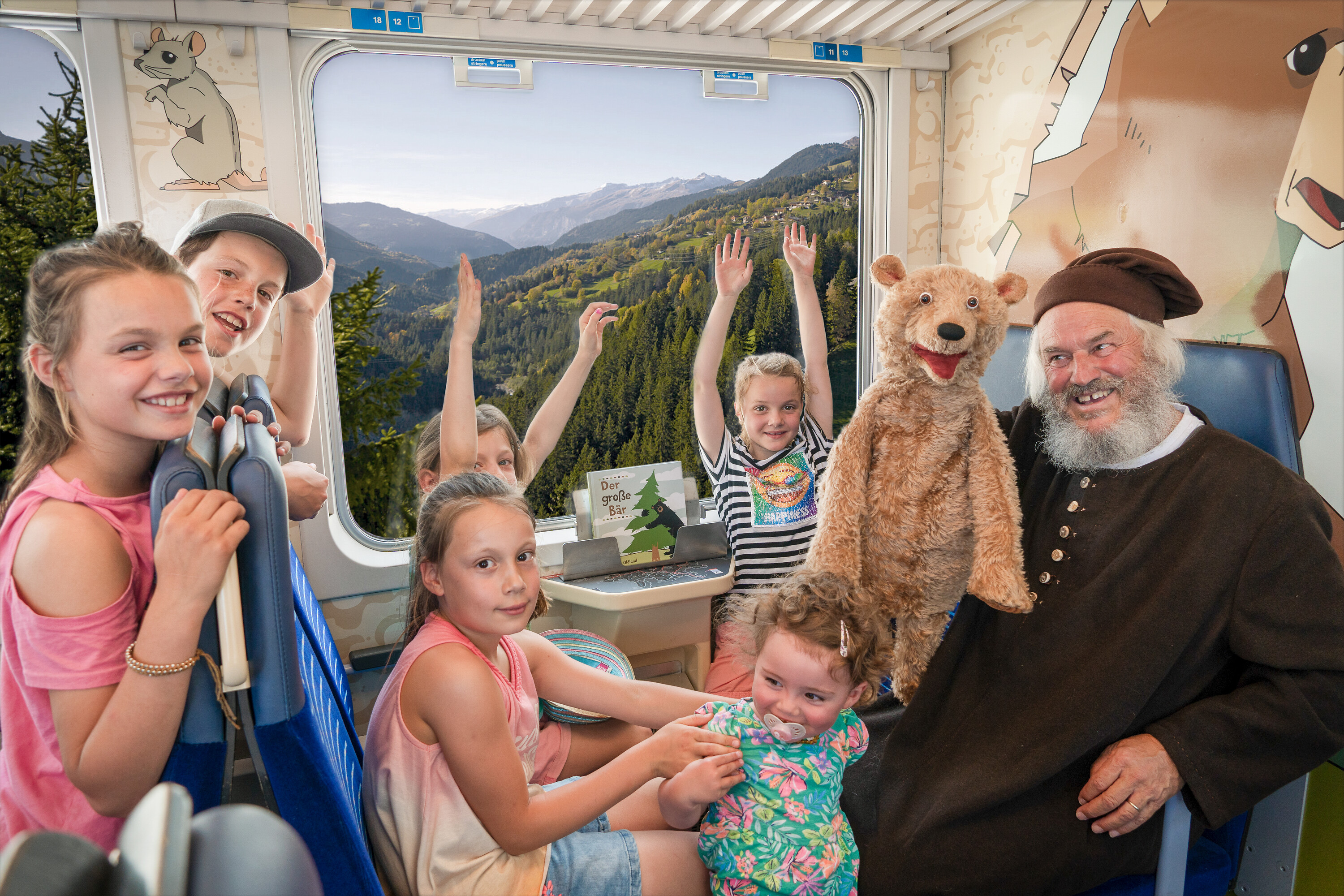 Mit der Rhätischen Bahn (RhB) zu Napa, Amelia und Meimo: Im Bärenlandwagen stimmen sich Besucherinnen und Besucher vom Bärenland Arosa bereits bei der Anreise auf die Bären ein. Für noch mehr Kurzweil während der Fahrt von Chur nach Arosa sorgen ab Juli die neue Bärenland-Safari und Bärenfreund Lumpaz.