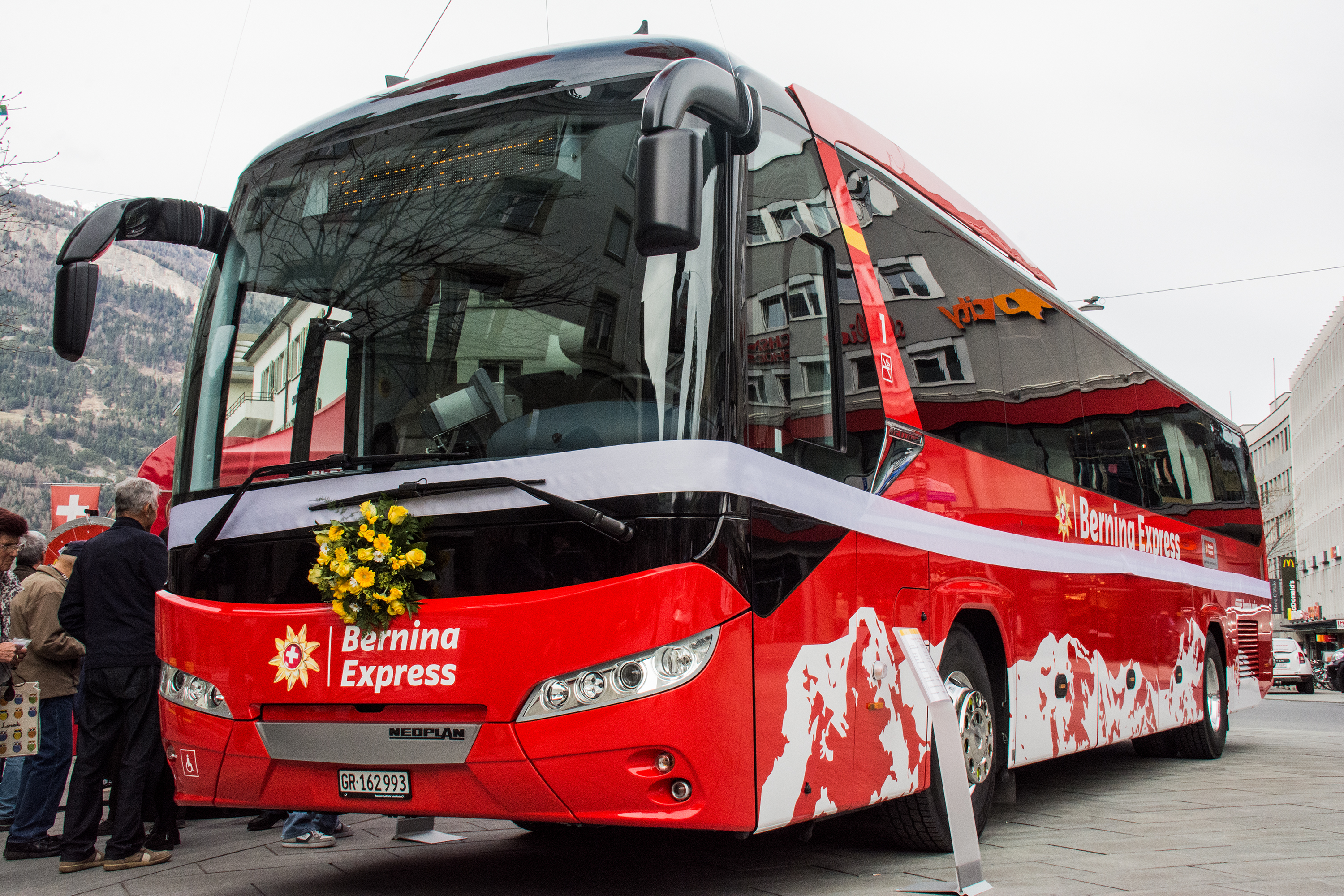 Von Tirano, dem südlichsten Punkt der Berninalinie, nach Lugano oder umgekehrt transportiert der Bernina Express Bus seit 2010 jährlich rund 17 000 Gäste aus der ganzen Welt. Der Reisebus, betrieben von PostAuto Graubünden, ermöglicht den Fahrgästen des Bernina Express ab dem 17. April bis zum 29. Oktober 2017 eine bequeme, komfortable Anreise zur Berninalinie als auch eine angenehme Weiterreise ins Tessin. Der neue Bus bietet Platz für 49 Gäste, ist edel gestaltet, hat eine breite Bestuhlung mit ausreichend Beinfreiheit und an jedem Platz einen USB-Anschluss, um Geräte aufzuladen. Zudem können sich die Reisenden ab Mai 2017 mit den eigenen Smartphones, Tablets und Laptops neu mit dem InfoT(r)ainment des Bernina Express verbinden. Am Freitag und Samstag, 24. und 25. März 2017, wird der neue Bus erstmals der Öffentlichkeit, zusammen mit einem Bernina Express Panoramawagen auf dem Alexanderplatz in Chur, präsentiert. Während den beiden Tagen werden rund um die beiden Fahrzeuge musikalische Unterhaltung, Wettbewerbe und Spezialitäten aus der Valposchiavo angeboten.