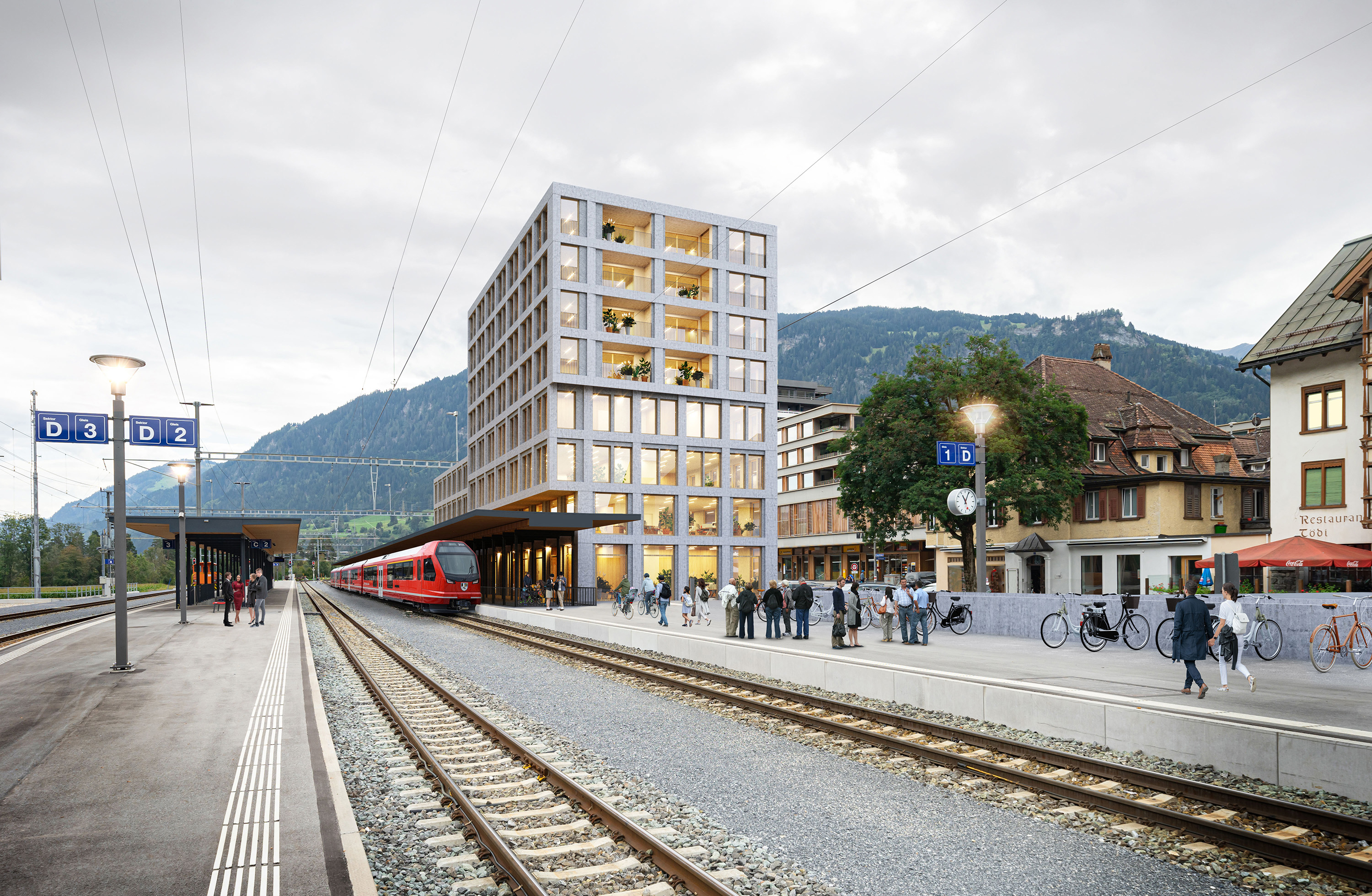 Die Rhätische Bahn (RhB) hat in Zusammenarbeit mit der Gemeinde Ilanz/Glion einen Projektwettbewerb für die zukünftige Gestaltung des Bahnhofareals in Ilanz durchgeführt. Die eingeladenen Teams hatten den Auftrag, eine städtebaulich gut ins Ortsbild passende Bahnhofsüberbauung zu entwerfen, die nutzungsmässig, verkehrstechnisch und funktional überzeugend und nachhaltig wirkt sowie die Gestaltung des ganzen umliegenden öffentlichen Raumes miteinbezieht. Die Projektierung der behindertengerechten Postauto-Umsteigestation sollte die wichtige ÖV-Drehscheiben- und Zentrumsfunktion stärken. Zudem war ein neuer öffentlicher und fussgängerfreundlicher Platz zu gestalten. Aus den insgesamt sechs Wettbewerbsbeiträgen ging einstimmig das Projekt «Gleis 1» von Giubbini Architekten in Chur als Sieger hervor.