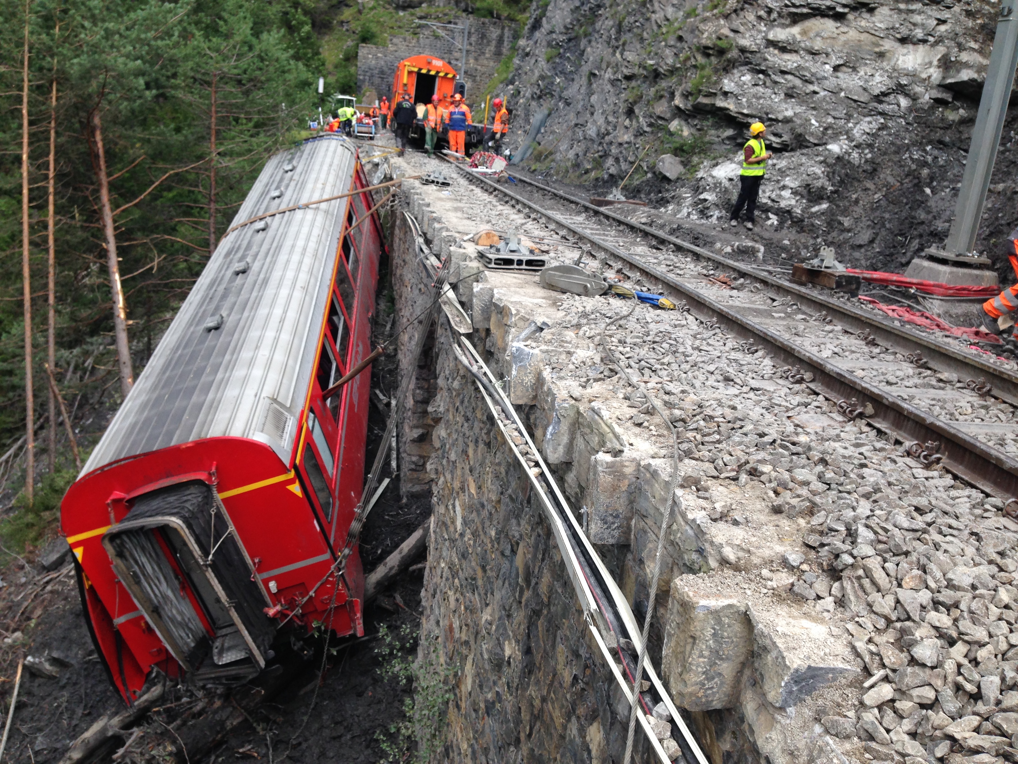 Bereits gestern Abend konnte die Lok weggeführt werden. Heute Morgen wurde das Erdmaterial von den Schienen geräumt. Als nächstes sollen nun die drei entgleisten Wagen weggeführt resp. geborgen werden. Die beiden Wagen, welche an zweiter und dritter Stelle hinter der Lok angehängt waren, werden mittels Gleiskran angehoben und wieder aufgegleist. Die Bergung des vordersten Wagens, welcher vom Bahntrassee in den Hang gerutscht war, gestaltet sich schwieriger. Hier evaluiert die Abteilung Infrastruktur der Rhätischen Bahn Möglichkeiten. Sobald alle Wagen geborgen sind, kann mit der Instandstellung der Bahntechnik (Gleis/Fahrleitung) begonnen werden. Die Verantwortlichen der Rhätischen Bahn gehen davon aus, dass die Arbeiten bis am Samstag, 16. August 2014 abgeschlossen werden können. Bis dahin bleibt die Strecke Samedan – Chur gesperrt.