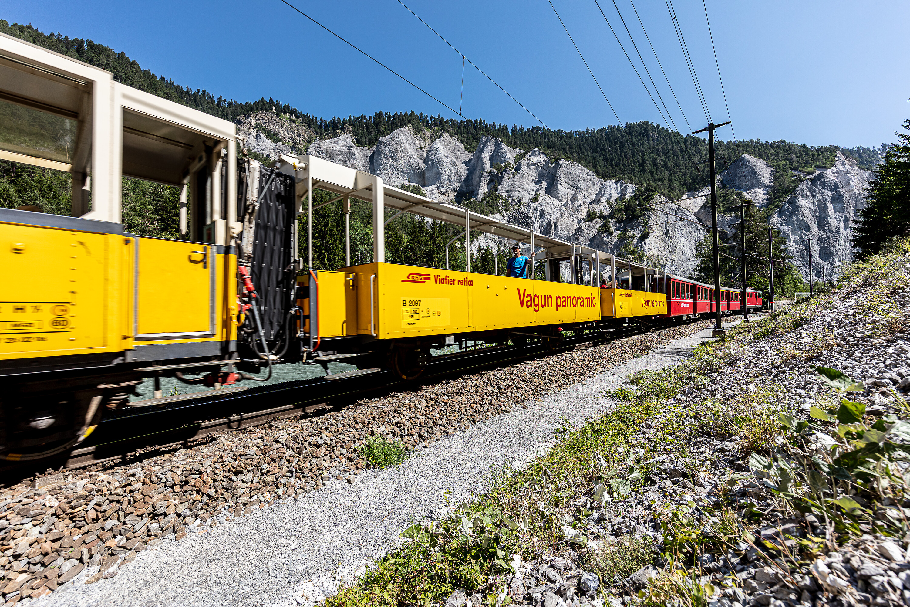Beim Ausflug in vergangene Bahnzeiten kann man sich auch verpflegen: In Zusammenarbeit mit der IG Zügen-Landwasser (www.igzl.ch) wird auch dieses Jahr am Bahnhof Wiesen das «Züga-Beizli» geführt. Von Filisur aus bietet sich die Möglichkeit, mit der Tschutschubahn «Landwasser Express» zum Landwasserviadukt zu fahren (12.05.-30.06. und 20.10.-31.10.2021 Mittwoch bis Sonntag, 01.07.-17.10.2021 täglich). Beim Viaduktplatz am Fuss des imposanten Wahrzeichen Graubündens laden ein Infokiosk, Sitzbänke und eine Feuerstelle zum Verweilen ein. Steilabfallende, gezackte Felswände, ausgedehnte Wälder und der wild fliessende Rhein bilden eine fantastische Kulisse für eine entspannte Fahrt im Erlebniszug Rheinschlucht. Er verkehrt jeden Samstag und Sonntag vom 8. Mai bis 31. Oktober 2021 mehrmals auf der Strecke zwischen Chur und Ilanz. Mit offenen Aussichtswagen, zwei Personenwagen sowie einem Gepäckwagen zum Verlad von Fahrrädern und Booten kann die Rheinschlucht von ihrer besten und vielfältigsten Seite erlebt werden. Geniesser wie auch Aktiv-Ausflügler kommen auf ihre Kosten.